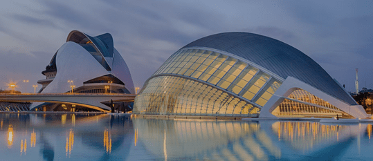 The intricate glass facade of Madrid´s train station, Estacion de Atocha is beautifully lit up in blue and purple at night